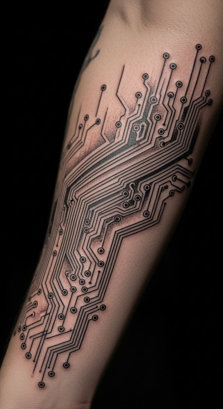 Circuit patterns on the forearm map your tech side. Pattern on paper first. Easy start. Find $80 packages. Forearm focus. Sleeve for healing. Use pattern repeats. This is for arm artists.