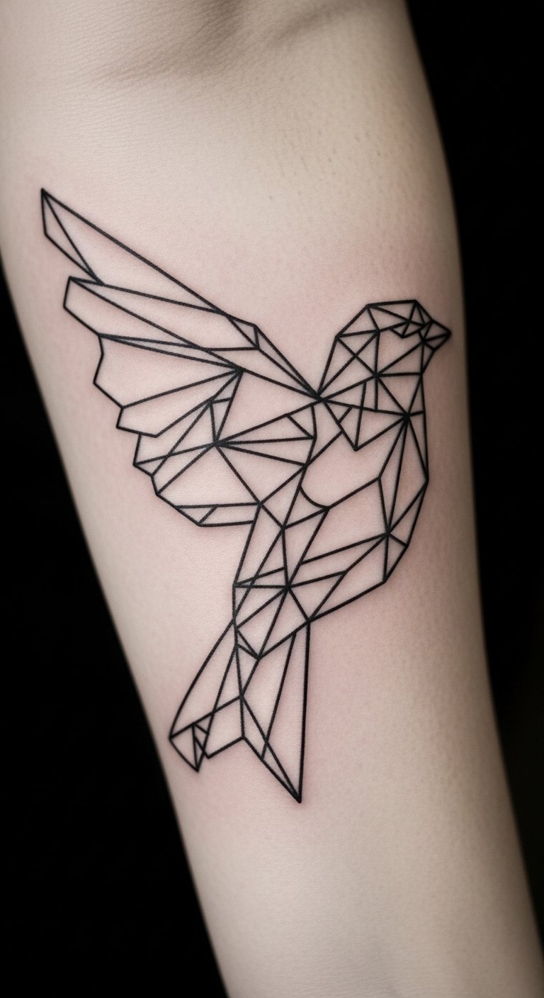 Geometric bird tattoos bring modern edges. Picture shapes forming a bird on your arm. It’s structured and cool.