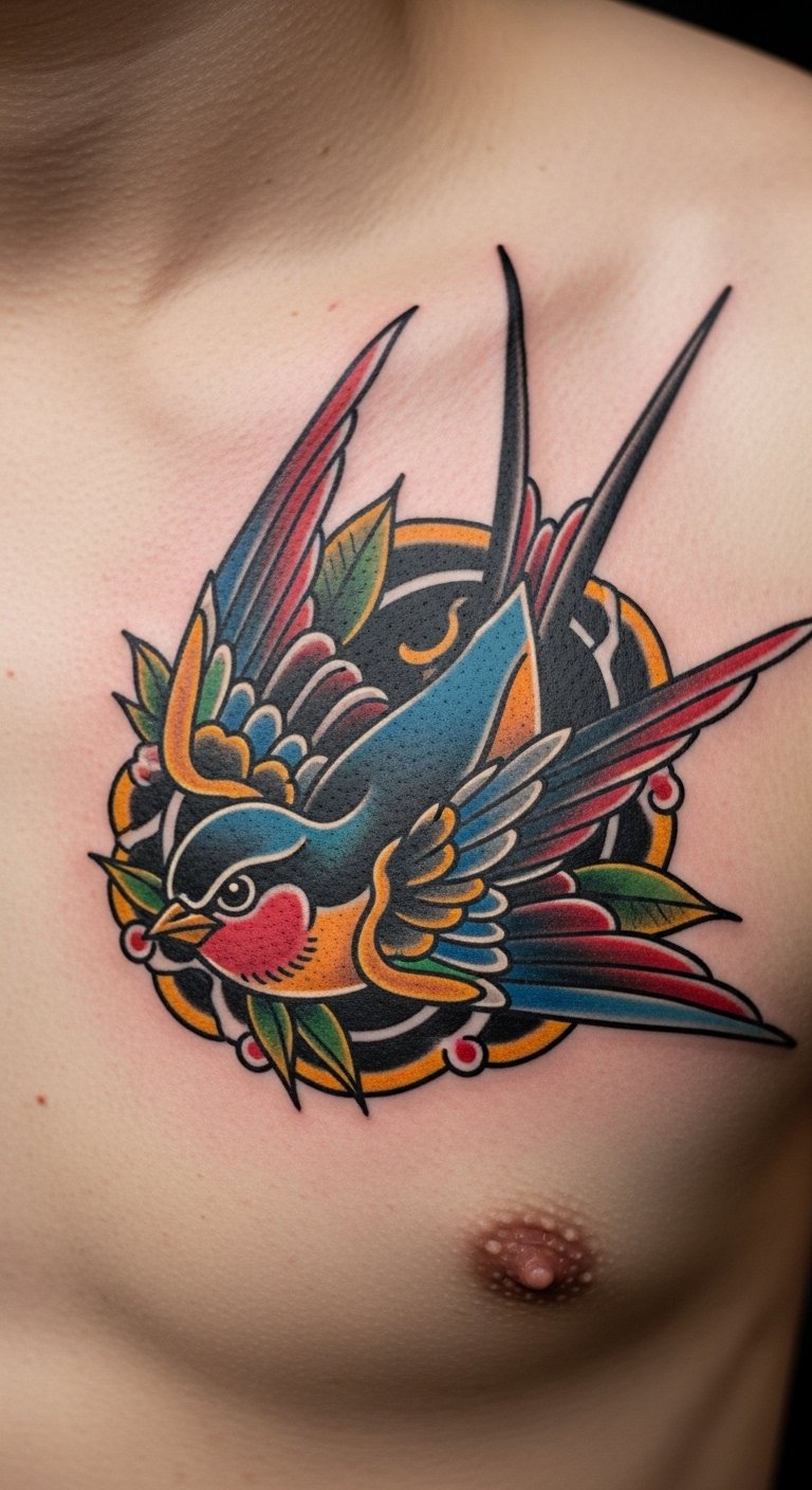 Neo-traditional bird tattoos mix old and new. Envision bold colors on your chest. They tell rich stories.