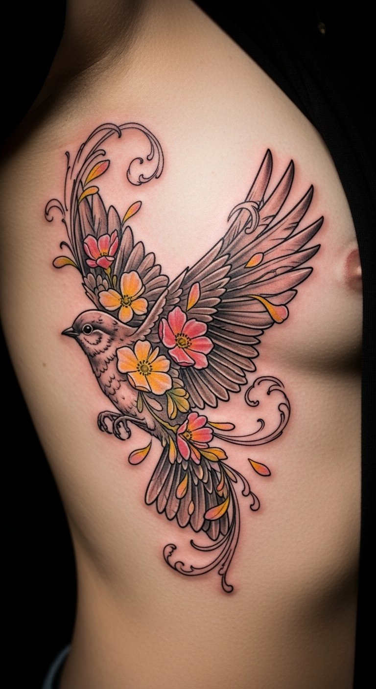 Botanical bird tattoos connect to nature. Imagine leaves with a bird on your side. They grow with you.