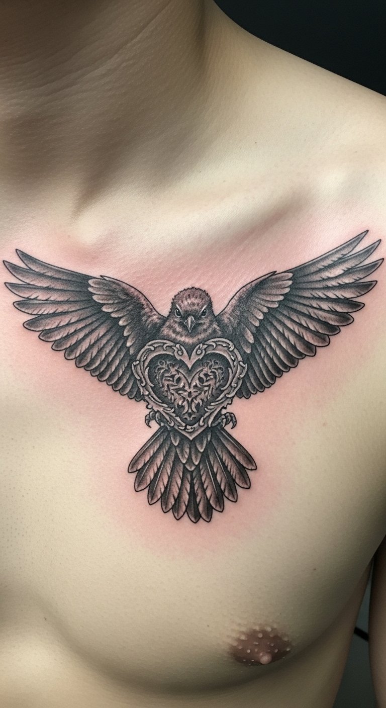 Chest bird tattoos hit close to the heart. Envision wings over your chest. They express core feelings.