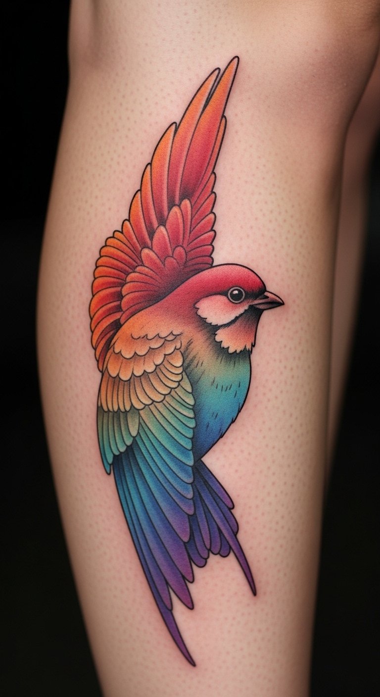 Gradient bird tattoos play with hues. Imagine fading colors on your leg. They feel vibrant.
