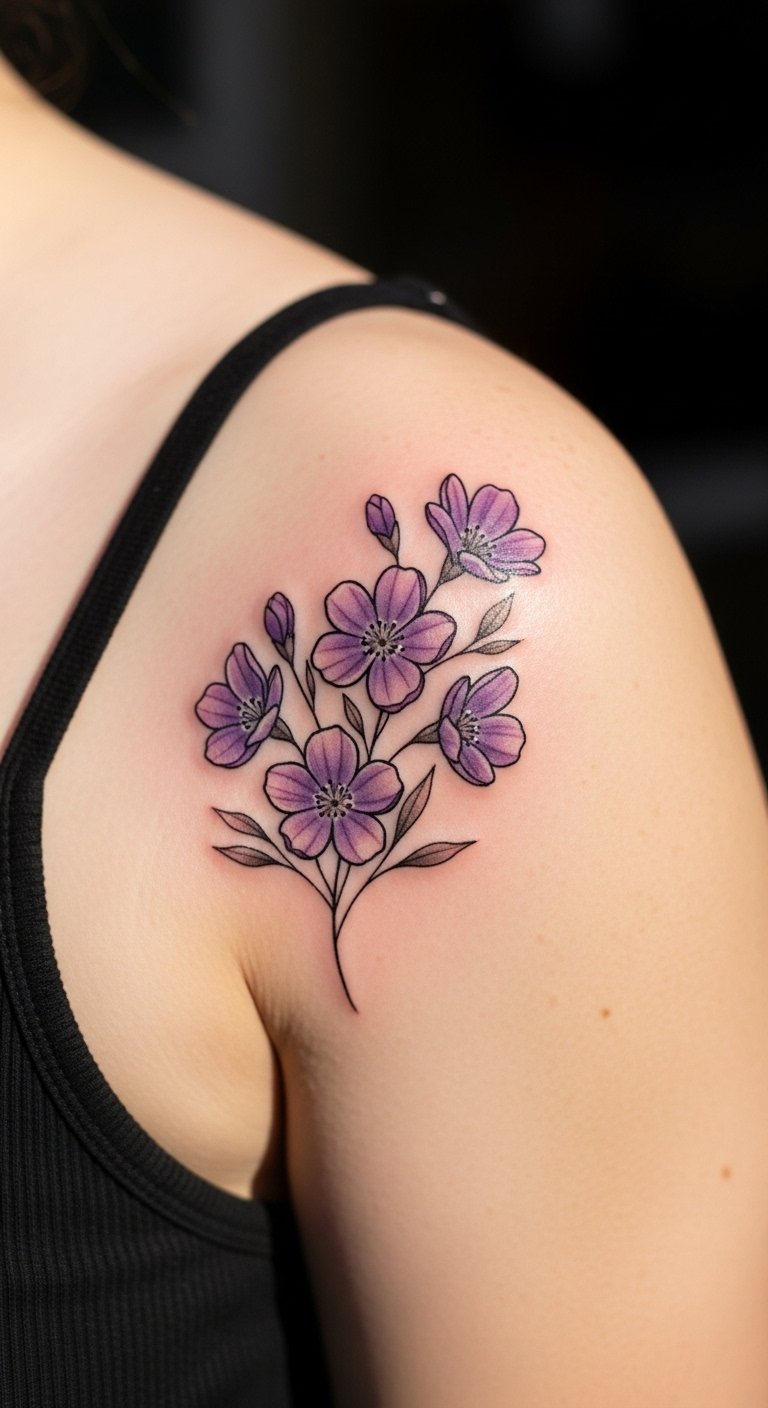 July’s larkspur tattoo signifies strong ties and positivity. Go for it to honor relationships. Set it on your forearm for easy viewing. Sketch ideas with household art supplies. Include a star for added symbolism. Use simple colors to keep expenses down. Reach out to local tattoo spots for quick advice. This helps you craft a design that’s all yours. Make it modest for straightforward care. In the long run, it becomes a proud symbol.