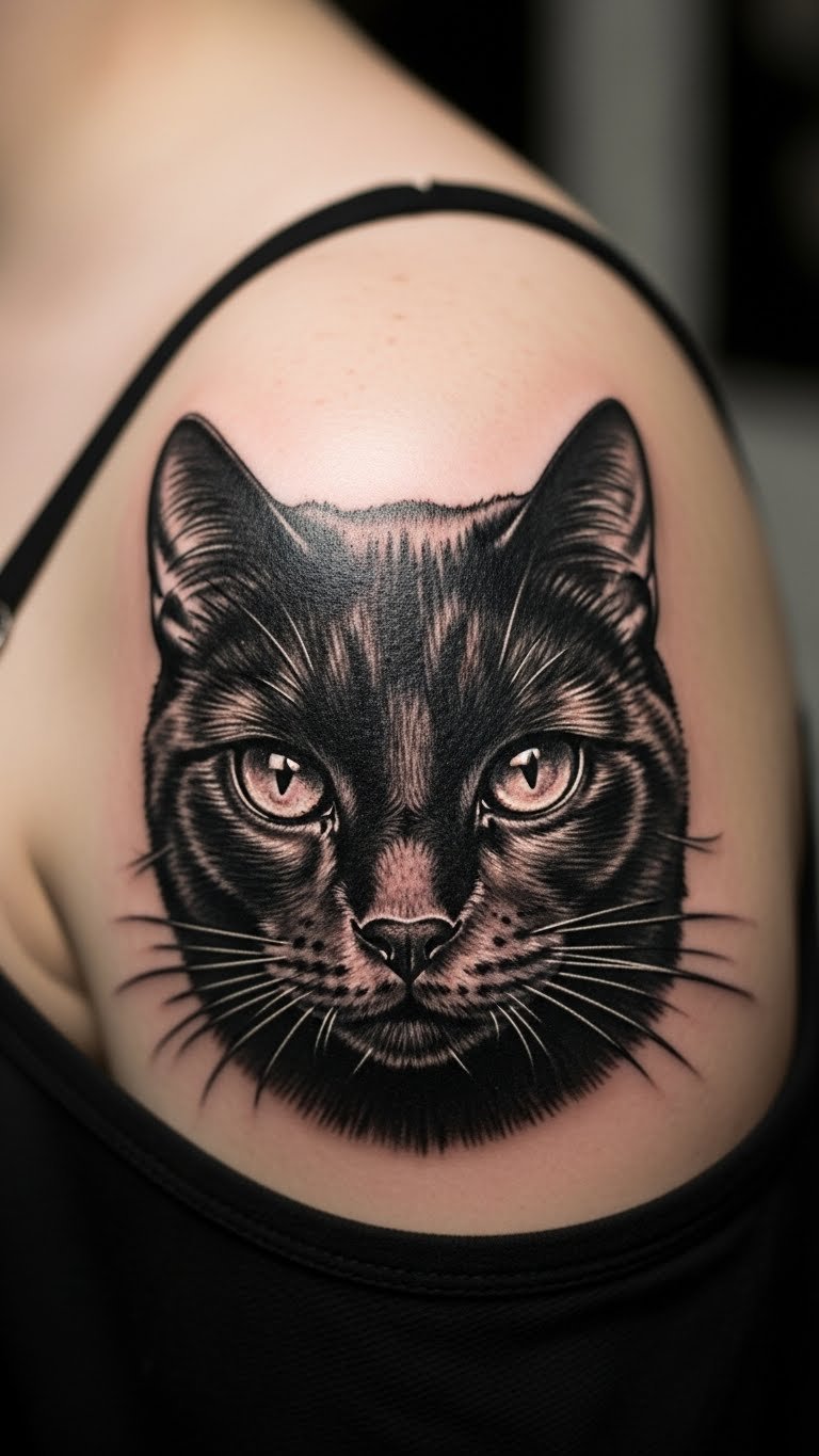Black cat tattoos with eye focus create an intense, otherworldly feel. Picture piercing eyes that draw you in, maybe on your back or ankle. This style adds a supernatural edge. Grab a pencil and paper to sketch eyes first. Find free tutorials online for eye drawing basics. For DIY fun, try henna kits from the store to mimic the design temporarily. Bold key: supernatural allure. Save money by choosing smaller sizes at walk-in shops. Mix in elements like moons using simple stencils. Practice with body paint at home before committing. These steps make it easy to add personal magic.