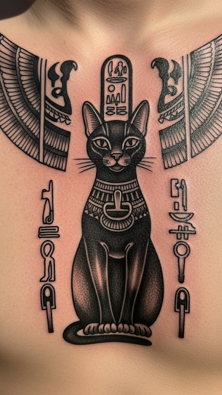 Black cat tattoos inspired by Bastet offer a nod to ancient protection. Imagine a cat pose like a guardian on your chest or leg. This design ties into history with ease. Draw inspiration from free museum apps showing Egyptian art. Use a cheap notebook to sketch your version. For a DIY trial, apply stick-on tattoos you find online. Bold key: protective spirit. Opt for affordable artists who specialize in cultural themes. Add simple details like ankhs with basic tools. Test at home with washable markers. This way, you celebrate heritage without big expenses.