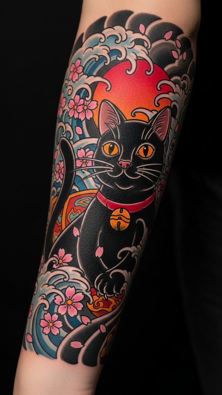 Black cat tattoos in Japanese style bring good fortune vibes. Think of a cat with wave patterns on your forearm. This look mixes luck and art simply. Search free image sites for Japanese motifs to start. Sketch it quickly on plain paper. Try DIY with affordable stamp kits for temporary versions. Bold key: lucky charm energy. Find budget tattoo events in your area. Incorporate elements like flowers using home stencils. Practice with face paints first. Keep it straightforward for real-world appeal.