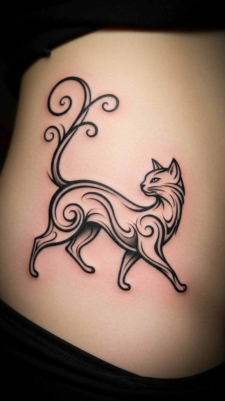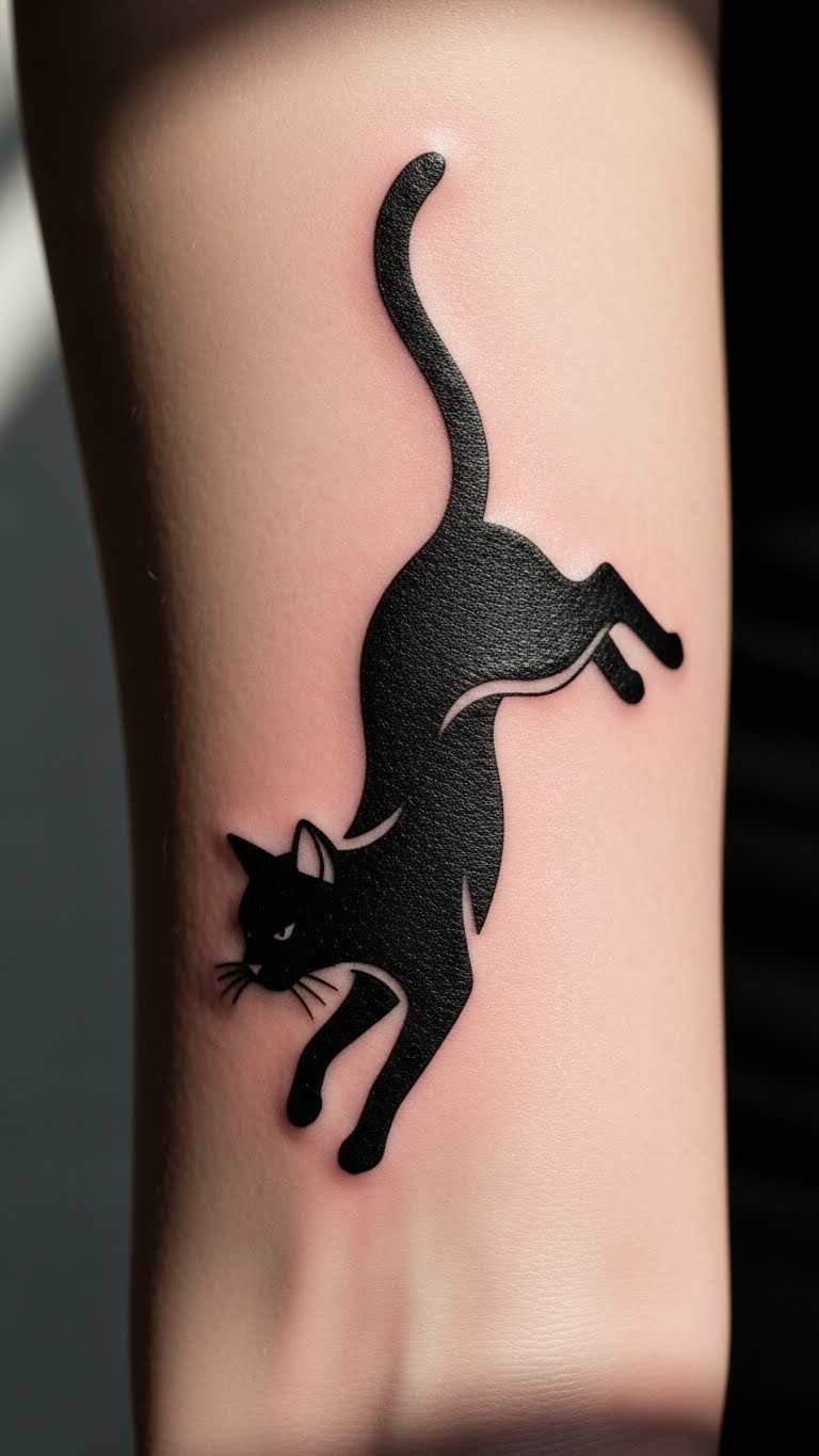 Black cat tattoos with curves show grace. Position on your hip for flow. This style is elegant. Find curve guides online. Draw curves on paper. Use bending wires for tests. Bold key: graceful lines. Seek curve specialists cheaply. Add swirls with tools. Experiment at home. Make it smooth and affordable.