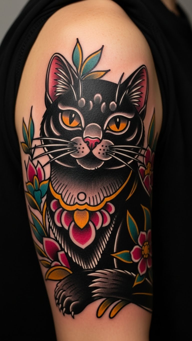 Black cat tattoos in neo-traditional style blend old and new. Envision a cat with added flair on your upper arm. This approach feels timeless. Look at free style guides online for references. Draw rough versions on scrap paper. Test with budget sticker tattoos. Bold key: timeless tattoo twist. Choose artists with package deals. Layer in details like banners using basic pens. Try it out with wash-off paints. Make it your own without overspending.