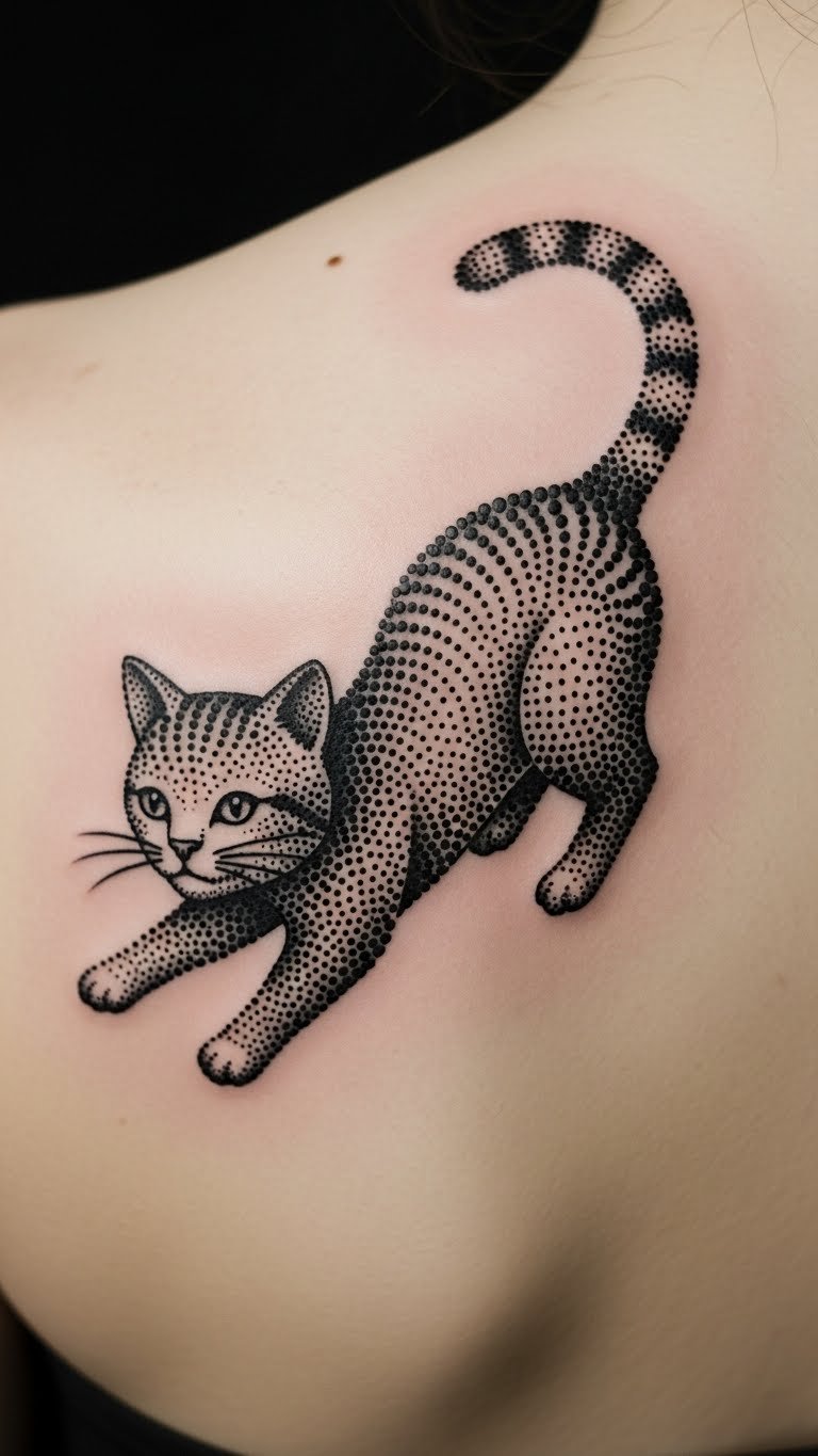 Black cat tattoos mixing dots and lines are versatile. Put on your finger for detail. This blend works well. Mix dot and line tutorials. Sketch mixes on paper. Use dot pens for tests. Bold key: dot-line fusion. Look for combo options. Add extras with tools. Experiment easily.
