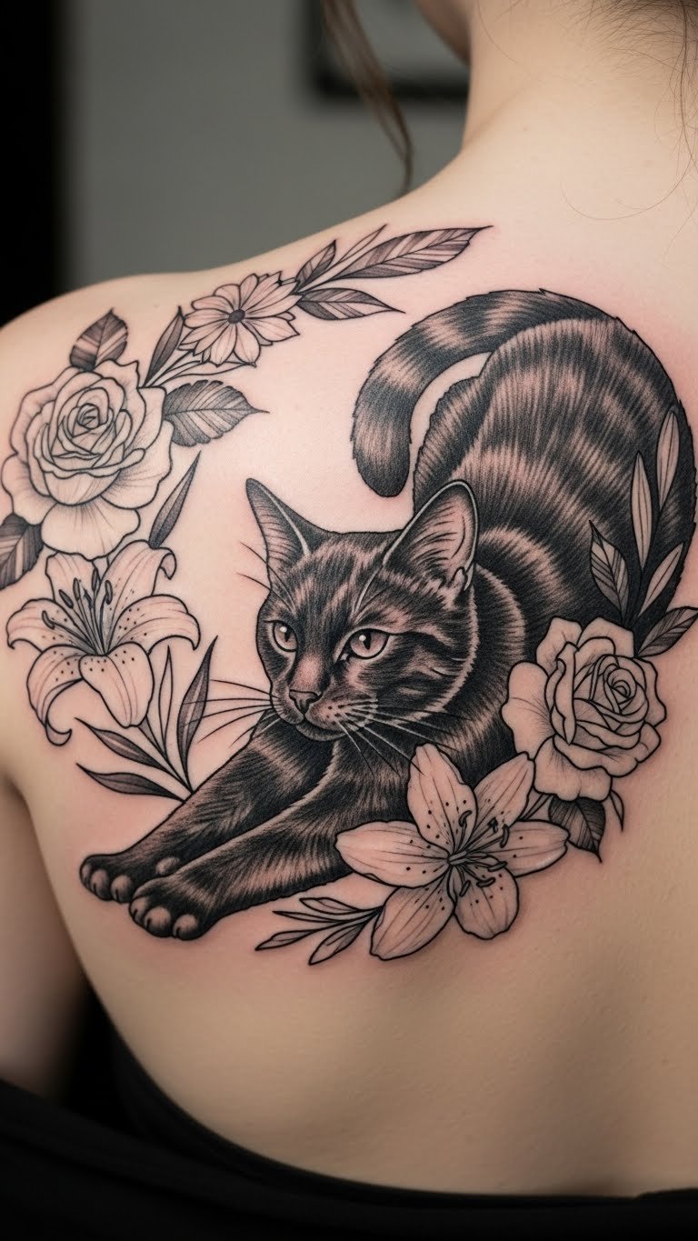 Black cat tattoos with flowers create a fresh mix. Place them on your back for beauty. This design flows naturally. Gather ideas from free flower tattoo pages. Sketch combinations on paper. Use floral stencils for home tests. Bold key: floral feline blend. Find affordable artists for add-ons. Draw flowers with colored pencils first. Experiment with garden-themed paints. Make it personal on a budget.