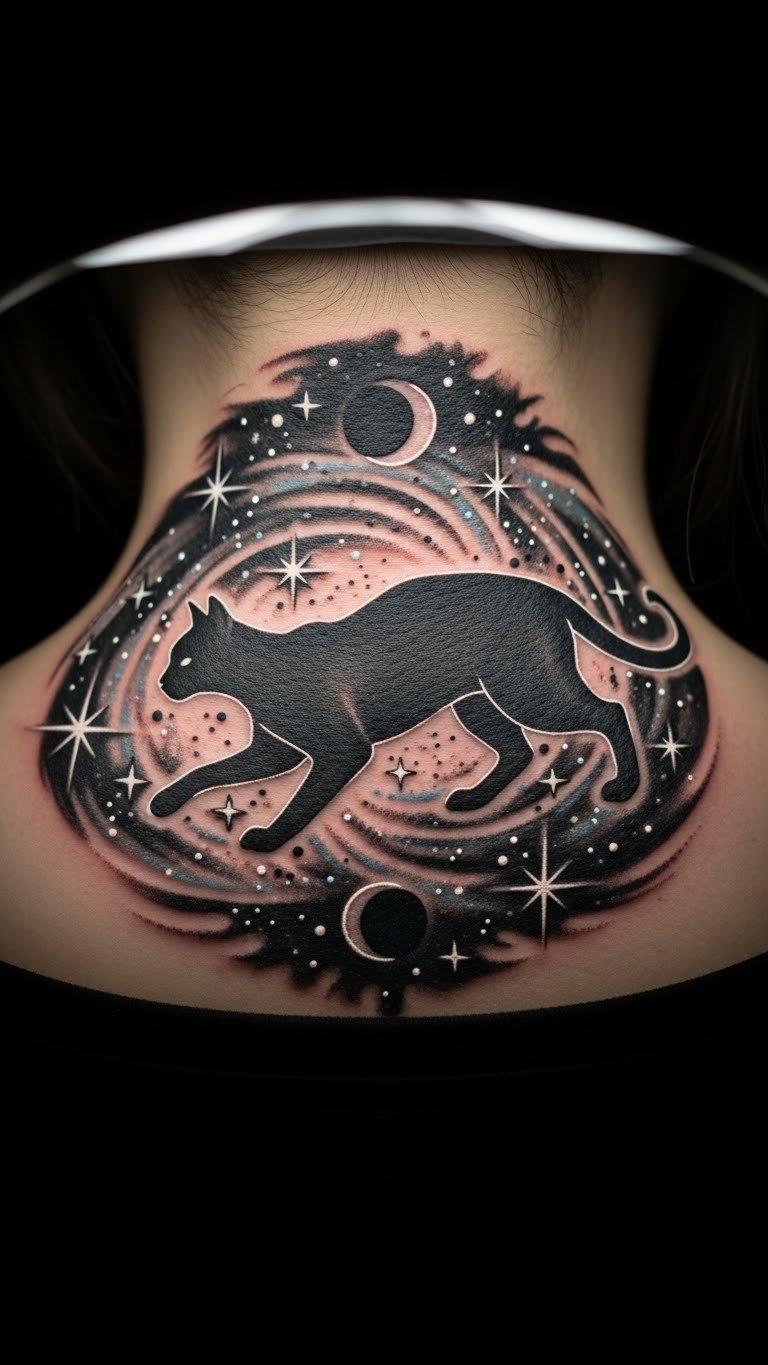 Black cat tattoos with celestial touches add wonder. Position on your neck for visibility. Mix stars and cats easily. Find star patterns online for free. Sketch your scene on paper. Use glow stickers for DIY fun. Bold key: cosmic cat vibe. Seek out night-themed deals. Incorporate moons with basic stamps. Practice with night lights. Stay within reach financially.