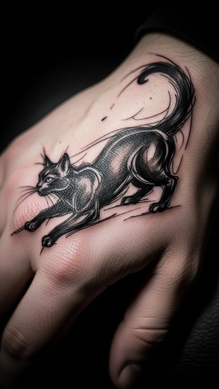 Black cat tattoos in sketch style feel artistic. Put it on your hand for creativity. This loose look is approachable. Grab free sketch apps for ideas. Jot on notebooks quickly. Use drawing pencils for tests. Bold key: artistic sketch feel. Find flash options locally. Layer details with home pens. Experiment simply. This way, it’s fun and cheap.
