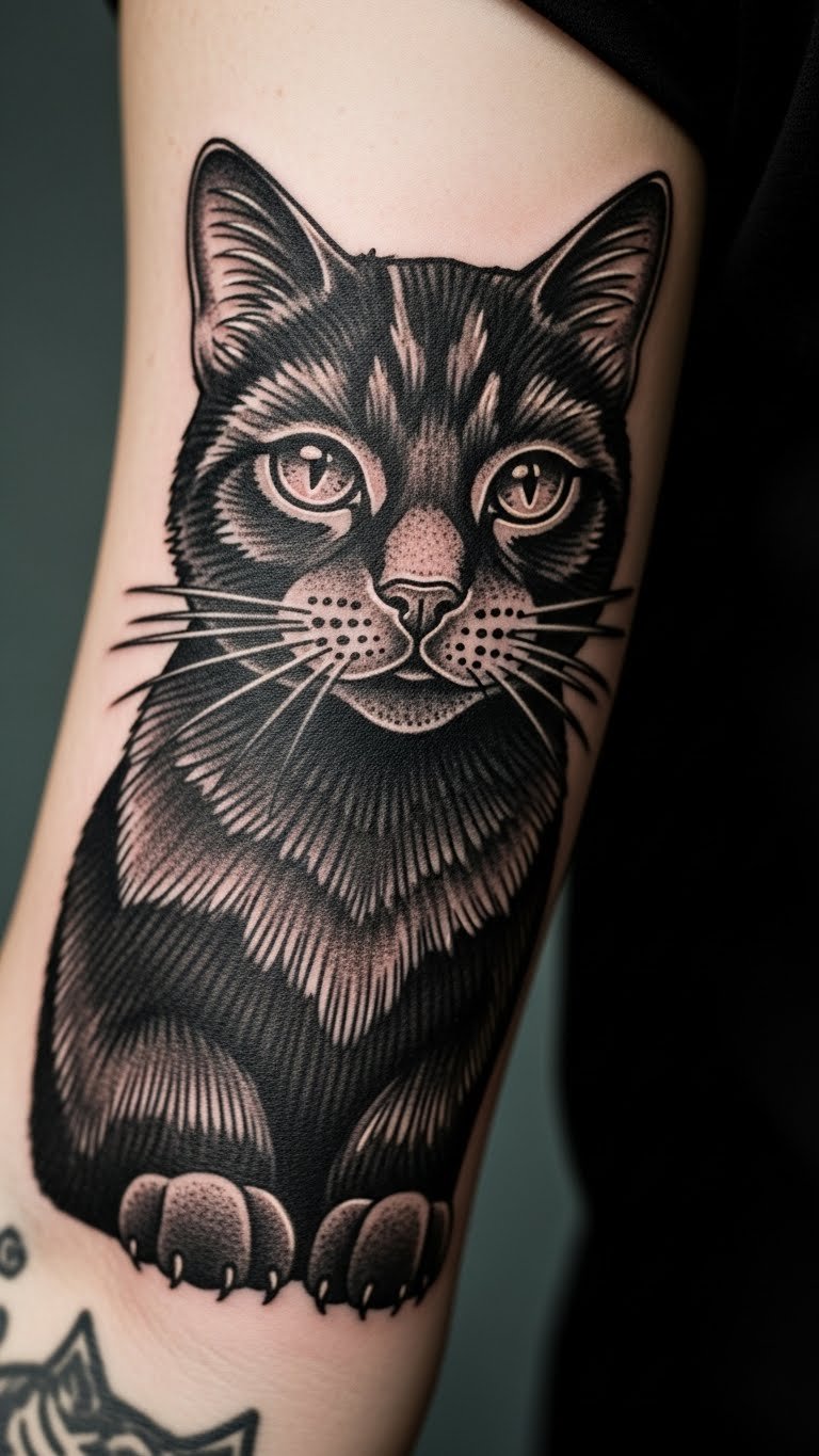 Black cat tattoos in dotwork add a playful dot pattern. Imagine it on your shoulder for fun. This technique is easy to love. Watch free dotwork videos online. Draw dots on paper to practice. Try DIY with dot stickers from stores. Bold key: playful ink dots. Look for deals on smaller designs. Combine with hearts using home tools. Test with body markers. Keep it light and accessible.