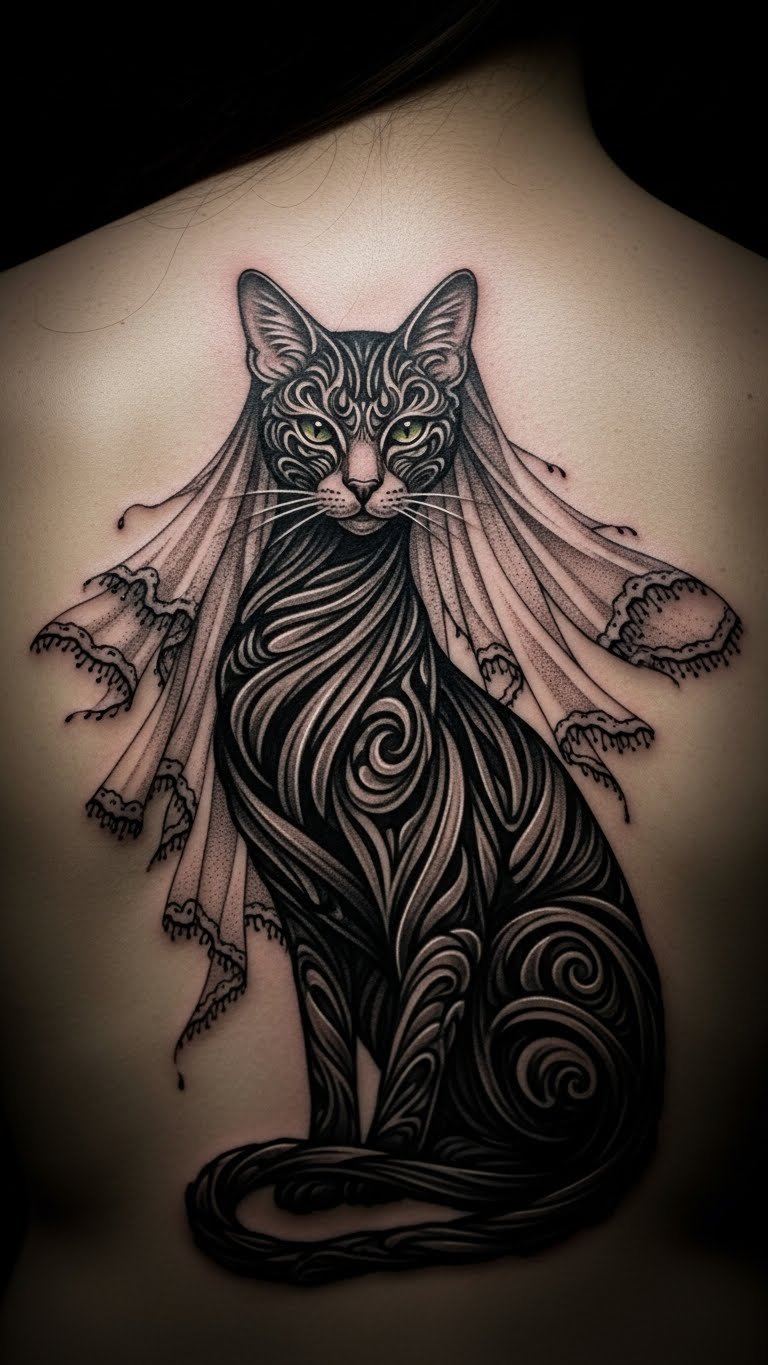 Black cat tattoos with veils add depth. Try on your back for mystery. This design intrigues. Look at veil ideas online. Sketch veils simply. Use fabric for DIY. Bold key: veiled mystery. Find themed artists. Layer with home items. Test designs. Keep it intriguing yet cheap.
