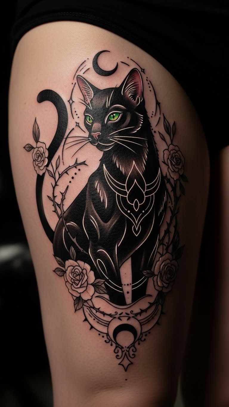 Black cat tattoos for feminine power empower. Place on your thigh for strength. This look inspires. Gather power symbols online. Draw your version. Use empowering stickers. Bold key: powerful feminine ink. Choose deals for this. Add symbols with pens. Practice simply. Stay empowered affordably.