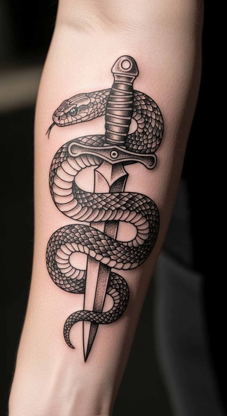 See the snake gripping a dagger on your forearm. It mixes danger with defense. Start by drawing the combo on paper. Free tattoo apps have templates. Aim for $60 at a local studio.