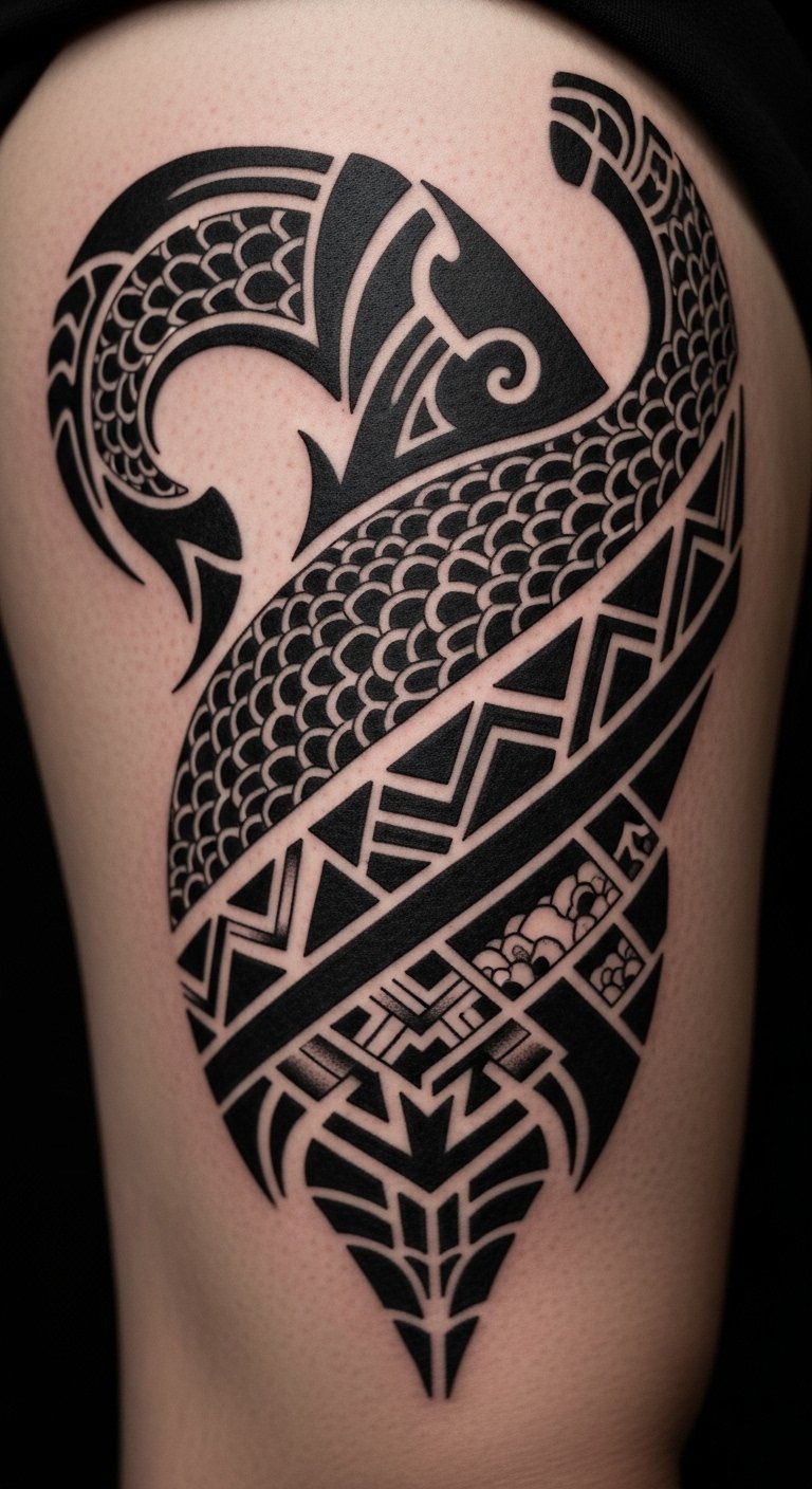 Go tribal on your thigh for cultural flair. It echoes ancient strength. Use dot patterns in your sketch. Online patterns are free. Cost around $90.