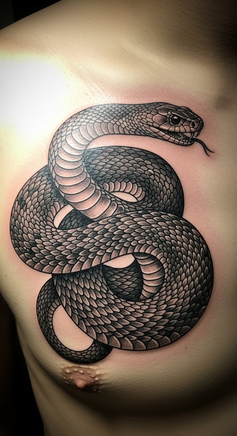 Picture a tight coil of a black mamba across your chest. This design screams inner strength. Start with a simple sketch on paper. Use online templates to trace it yourself. Find a local artist for under $100 if you go small.