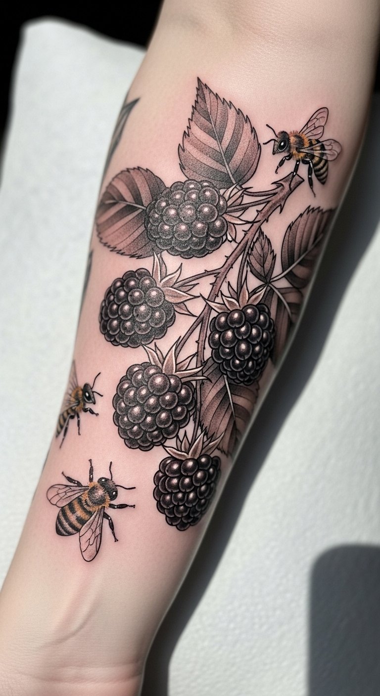 Add bees to your blackberry for a life cycle theme. Place it on your forearm for visibility. Sketch bees buzzing around berries on paper. Use household items like crayons for practice. Find an artist who does animal details affordably. Stick to two bees to save on time. Position it where you can see it often. Use stickers as a temporary test. Apply protective cream after to keep colors bright. Make a drawing with kids’ crafts at home. It takes little effort. Keep the bees small for a quick session. Link it to nature walks in your routine. Focus on the buzz of energy it brings.