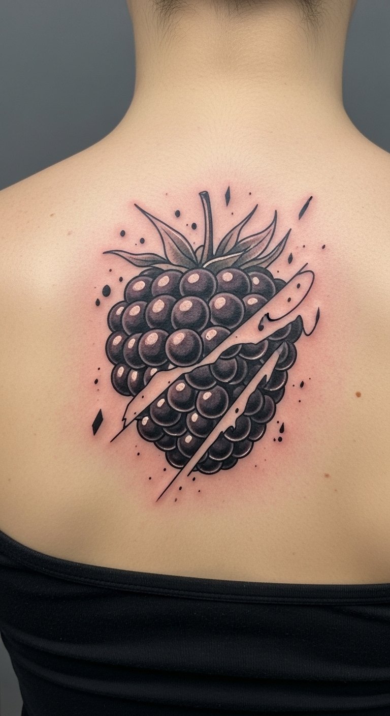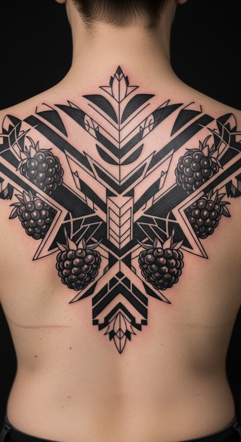 Use shapes for a modern geometric twist. A patterned blackberry works on your back. Draw triangles around a berry sketch. Use graph paper from home supplies. Seek artists who do geometry on a budget. Opt for black outlines to reduce costs. Place it centrally for balance. Try masking tape shapes on your skin first. Moisturize daily to preserve lines. Create a paper cutout as a DIY guide. It uses scraps you have. Keep the pattern symmetrical for ease. Tie it to your creative hobbies. Focus on clean edges for a sharp look.
