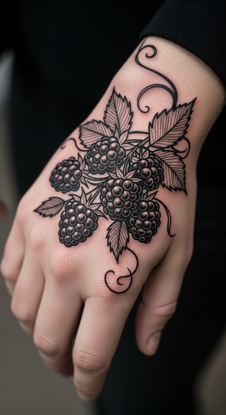 Think simple lines for a clean look. A minimalist blackberry cluster fits on small spots like your wrist. Start with a basic sketch on paper. Use a fine-tip pen to draw it yourself at home. This saves money on custom art. Pick a local artist who does line work. They charge less for simple designs. Go for black ink to keep costs down. Add a tiny thorn for a personal touch. Cover it with sunscreen daily to protect the ink. Try a temporary tattoo first to test the feel. This way, you avoid regrets. Keep the design under 2 inches for easy hiding. Pair it with daily routines, like glancing at it during work breaks. Make your own stencil using online templates and a printer. It costs under $5. Focus on what matters most in your life story.