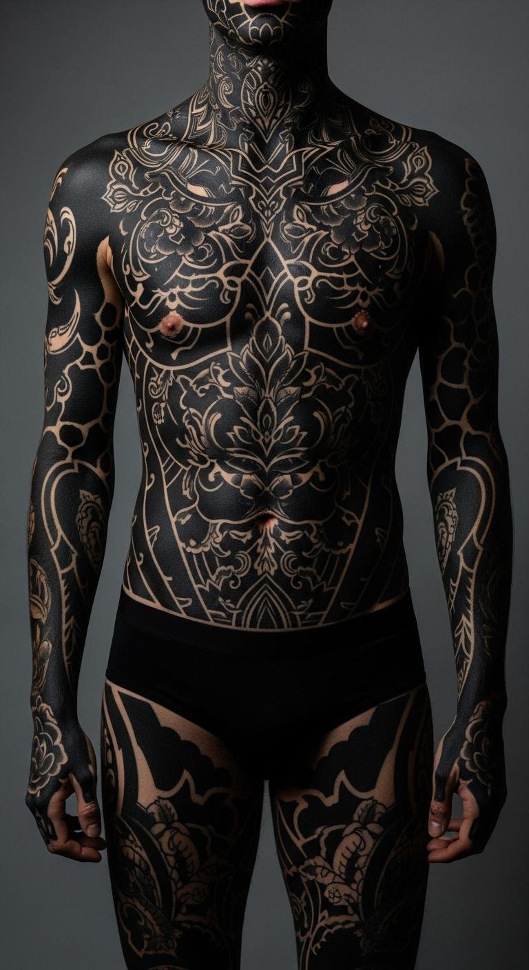 Torso blackout makes a strong center. It inks your chest and back solid. This adds impact to your body. Select areas that matter most to you. Look for sales at tattoo shops to cut costs. A home tip: Practice shading on paper before committing. Use basic supplies like markers for tests. Schedule sessions around your routine. Keep skin clean with household items. This way, you stay in control. Add details over time as needed.