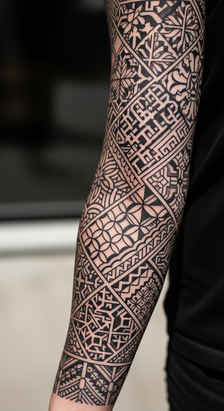 Geometric blackwork uses shapes like triangles and circles for a clean look. Start with a simple design on your wrist. Think about drawing it out first with a pen. This helps you see how it flows. Pick a spot that’s easy to hide if you’re new. For a budget option, use online templates from free sites and sketch them yourself. Add dotwork for texture. Keep lines straight for impact. Try practicing on paper before ink. This style works for sleeves too. Go for a small piece if you’re starting out. It makes your tattoo pop without much cost. Get feedback from friends on your design. Choose an artist who specializes in lines. You’ll love how it looks daily. Make it personal by adding a favorite symbol. This approach saves money and time.