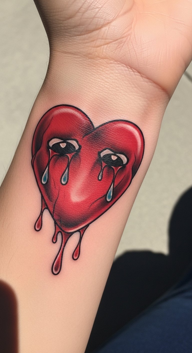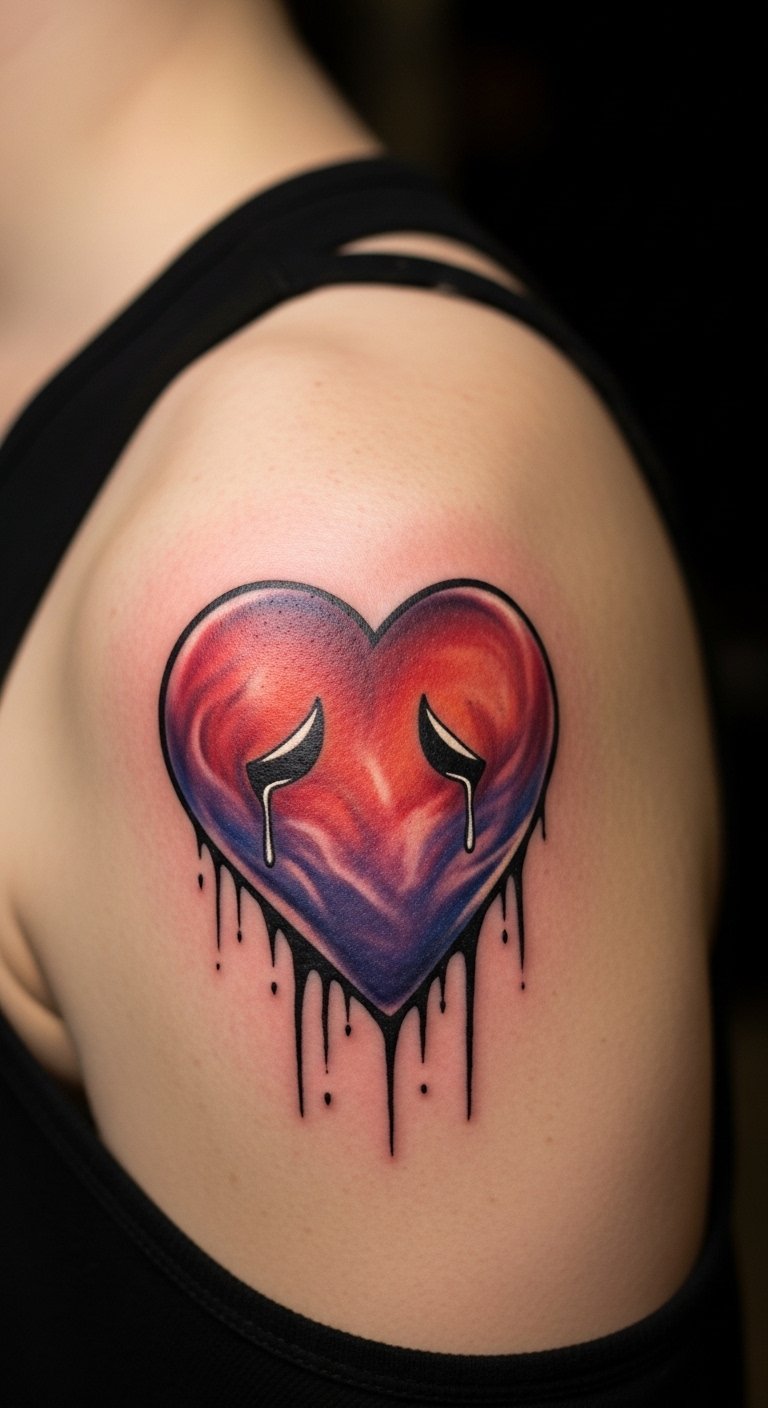 Bright colors bring this heart to life, mixing joy with sorrow. Imagine reds and blues blending in the design. Sketch ideas at home using crayons for a quick mock-up. Look for flash sales at local studios to keep prices low, around $80. Mix in your favorite shades with colored pencils on paper. Choose spots like the forearm for visibility. Add droplets with simple dots in your drawing. This style pops on bare skin and costs less with basic inks. Practice on fruit like an apple to see how colors flow. It turns tough feelings into something lively and real.