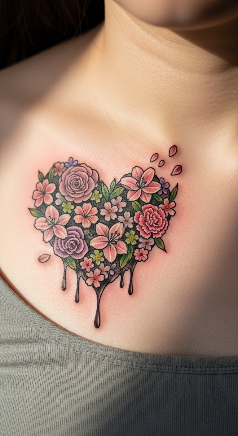 Flowers soften the heart, adding a gentle touch. Draw petals using flower stencils from craft stores. Find female-led studios for budget options, around $100. Press real flowers to paper for inspiration. Add them around the heart in your design. Place on the collarbone for elegance. This makes the tattoo feel personal and light.