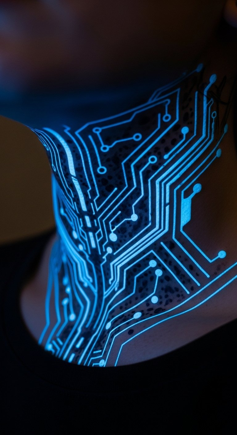 Get a tech vibe with blue circuits. Try a small pattern on your neck. Find free digital art for ideas. Use an app to design your own. It’s free and fast. Focus on clean lines for that future feel. Test with temporary tattoos first. Shops might offer discounts for new styles. This lets you explore without commitment.