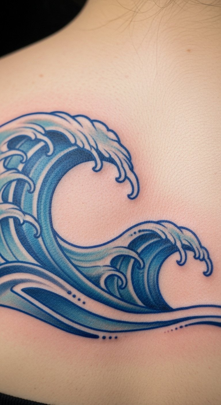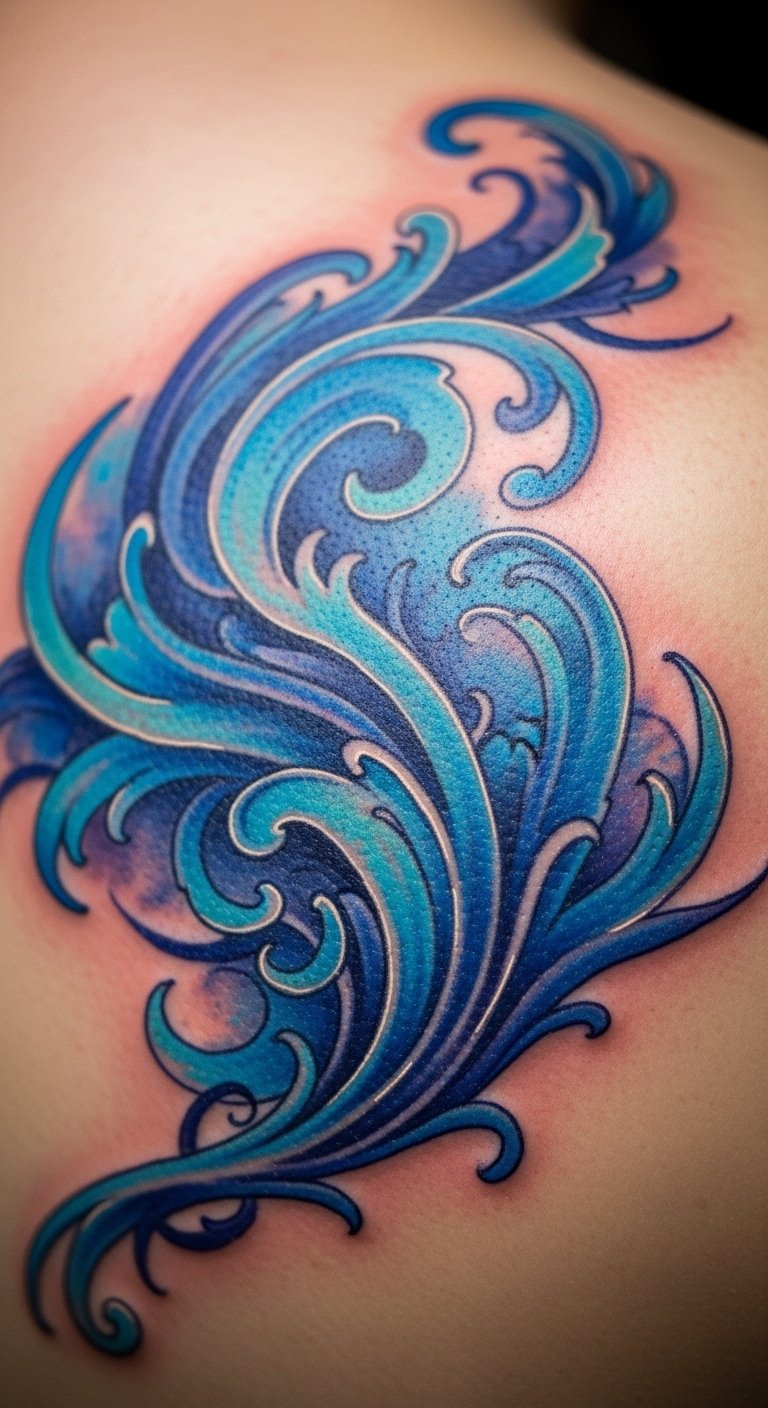 Create calm with blue waves. Place them on your back. Find serene designs online. Draw with blue shades at home. No big expense required. Keep lines smooth for relaxation. Local options keep it simple. This design brings peace every day.