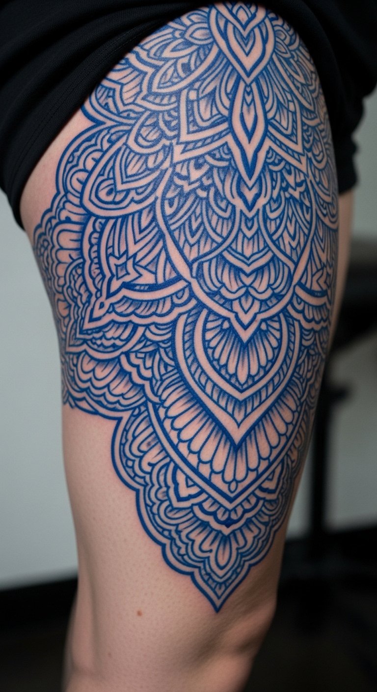 Go big with full blue coverage. Try patterns on your thigh. Search large ideas without paying. Sketch on large paper first. This helps plan ahead. Break it into sections. Find shops with package deals. It’s worth the investment for impact.