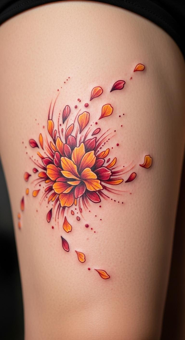 Burst petals on your thigh. It blooms bold. Petal collections from gardens. Spray paint bursts on paper. This design flowers outfits. Costs $100. Check group rates. Mix colors for pop. Heal with loose fits. Test with petal stickers. They stick temporary.