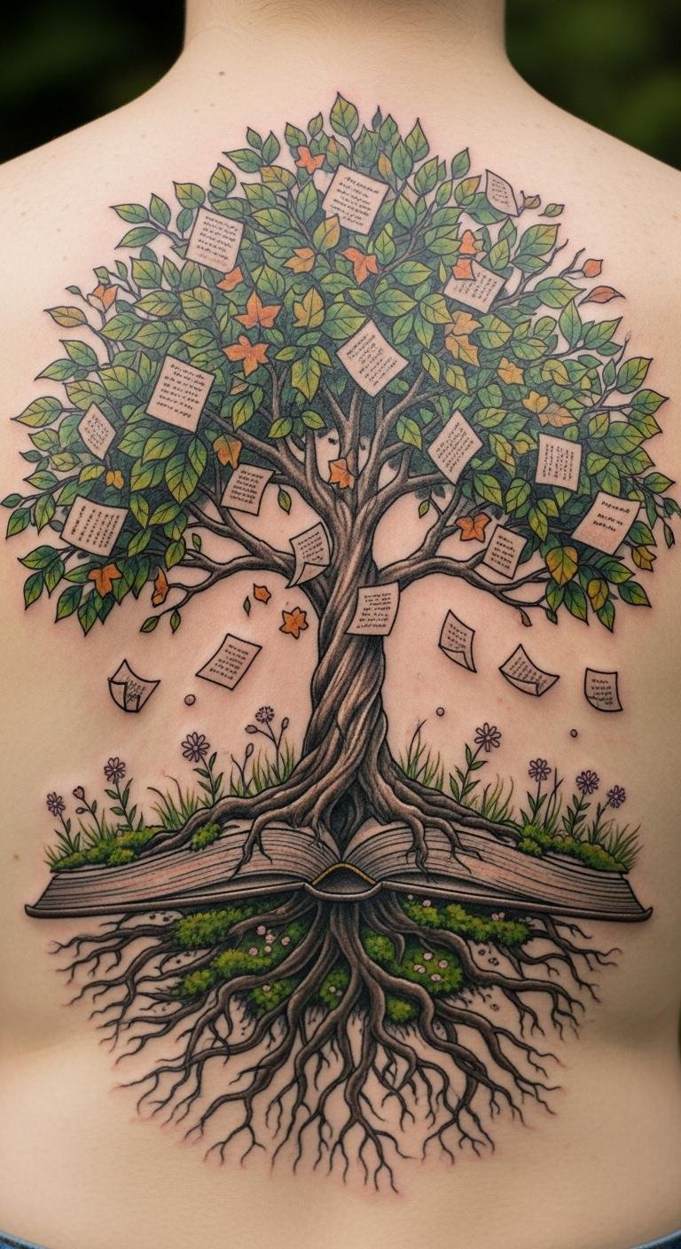 Grow a tree of books on your back. Leaves as pages branch out. This design roots deep. Sketch trees outdoors. Collect leaves for ideas. Session for $180. Make leaf rubbings at home. Press and trace. Trees mean growth. Books feed minds. Merge for life. Use earth tones. Protect from sun. This tattoo branches into stories.