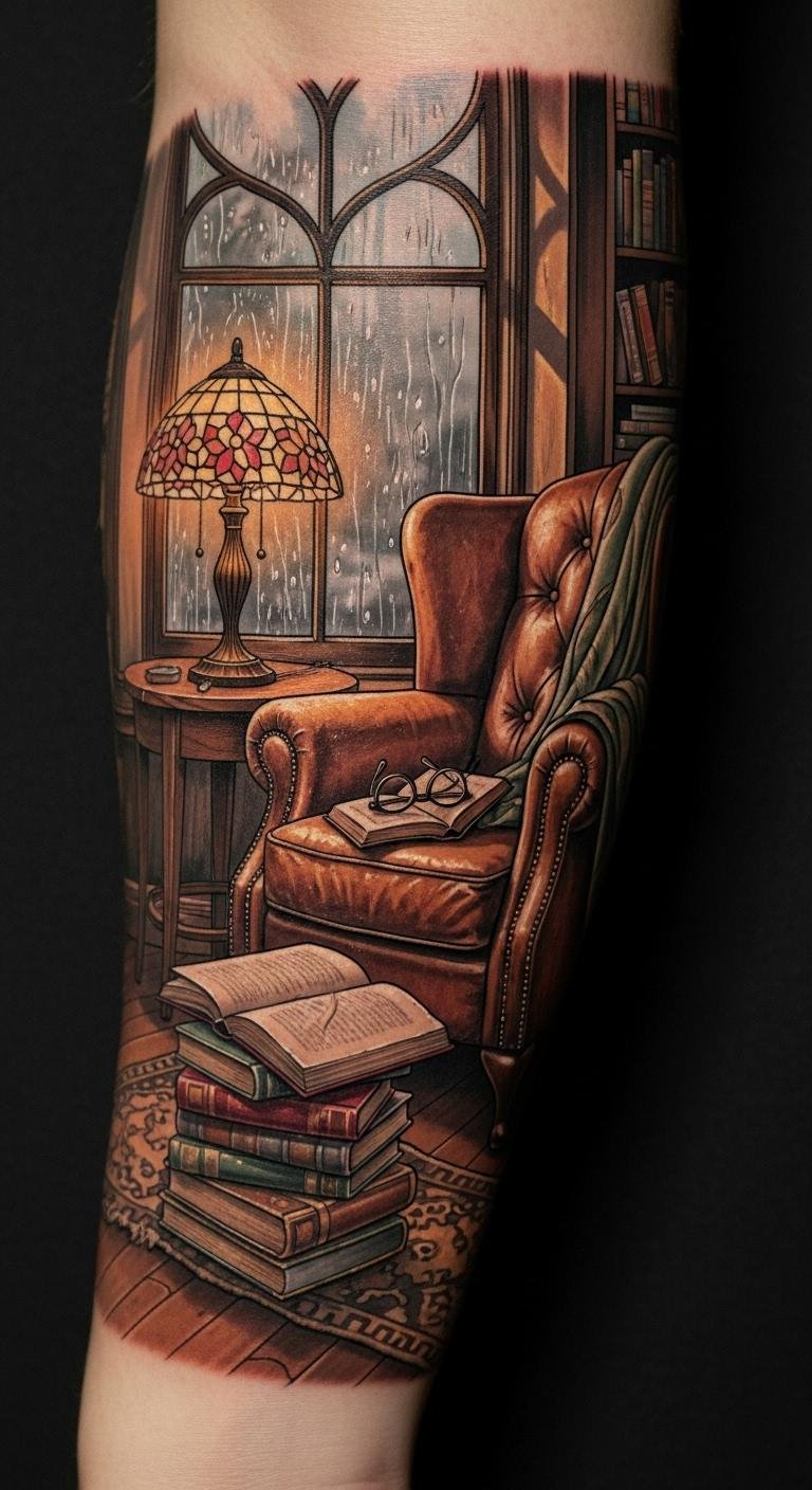 Set up a nook on your arm. Chair and books await. Design your space. Draw rooms on paper. Fee $110. Build a mini nook with toys. Arrange and photo. Nooks offer comfort. Books provide escape. Combine for haven. Use soft shades. Keep it cozy. This tattoo nests your reads.