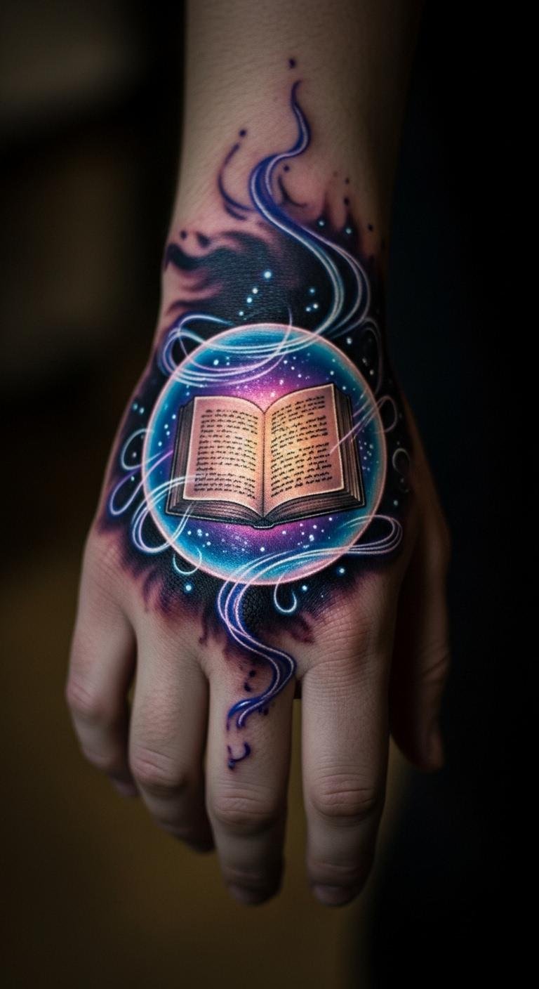 Enclose a book in an orb on your hand. Magic circles round. Globe paper books. Shine a light on them. Session for $90. Create orb drawings. Circle and shade. Orbs hold mystery. Books spark magic. Fuse for wonder. Use subtle glows. Handle with care. This tattoo orbs your dreams.
