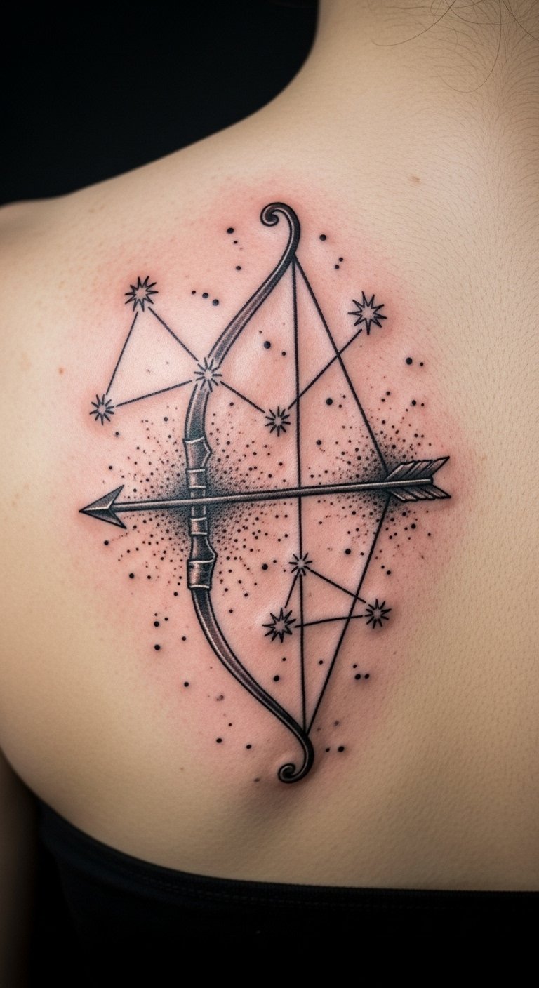 Sagittarius bow and arrow mix stars with direction. This design adds constellation dots. Short lines keep it cosmic. It means adventure. Spot it on your upper back. Budget tip: Draw stars at home with a pen. Free apps offer star maps. Use glow-in-the-dark stickers to test. Find astrological deals online. Keep it simple with black ink. This works for night outs. It inspires exploration. Chat about it with stargazers. You’ll feel aligned quick.