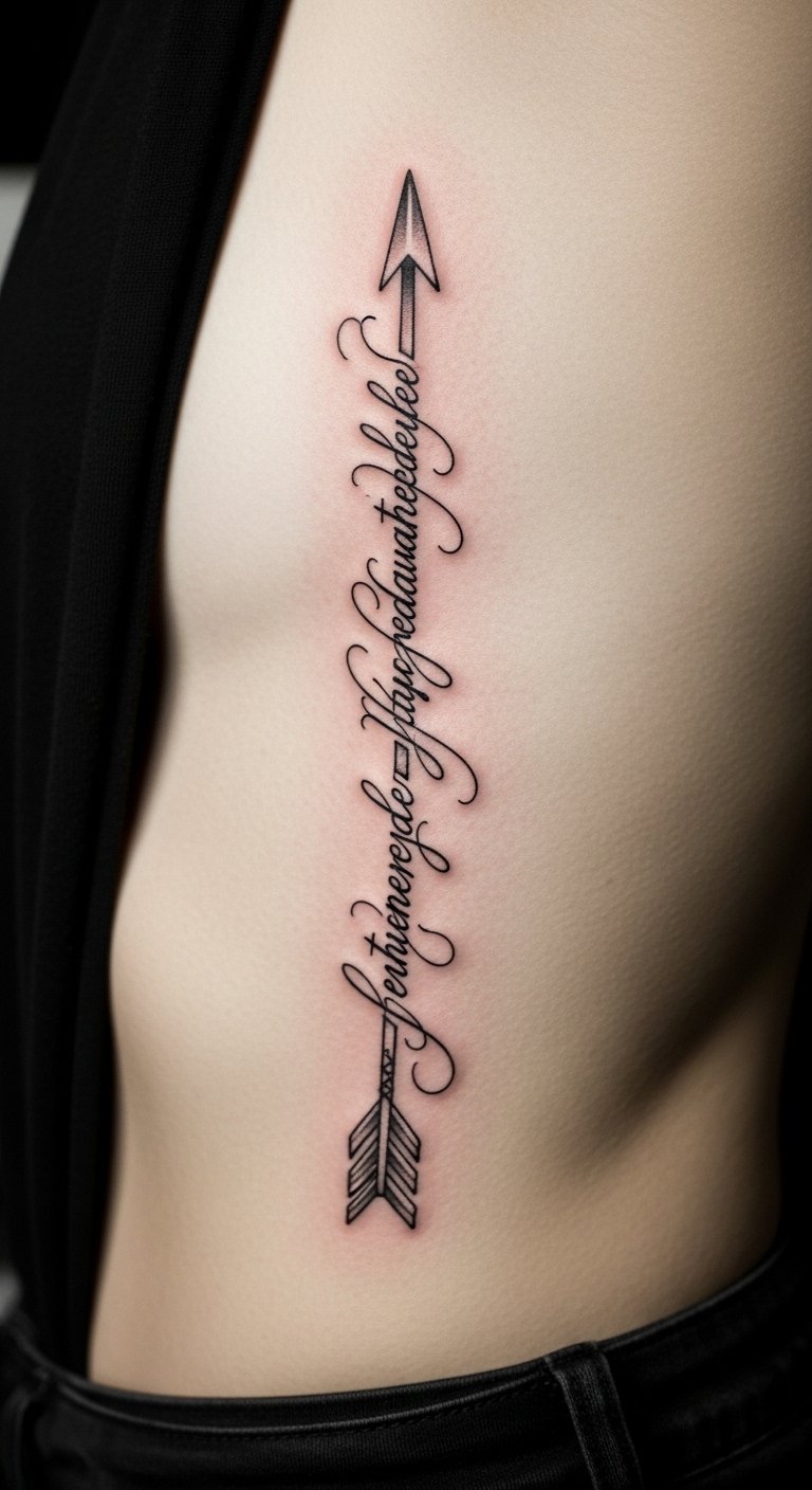 An arrow with quote adds words for extra meaning. This design weaves in a short phrase. Keep it motivational. It personalizes your story. Put it on your rib for intimacy. Budget: Write quotes on paper first. Free fonts online help. Use a marker for trials. Find personalized flash at low prices. Choose simple fonts. This reminds you daily. It marks milestones. Plan your words. You’ll connect deeper.