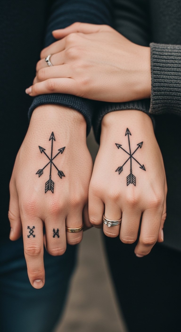 Matching couple arrows link two hearts. This design mirrors for pairs. Short links show unity. It means shared paths. Place on hands for hold. Save by drawing together. Free couple apps assist. Use temporary pairs. Look for duo deals. Add hearts if wanted. This suits dates. It strengthens ties. Discuss with your partner. You’ll bond more.