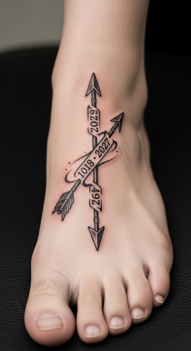 Arrow with date marking notes key moments. This design adds numbers along. Short digits personalize. It means achievement. Place on your foot for step. Budget: Write dates on calendars. Free date fonts online. Try sticker versions. Find timed deals. Keep it clear. This fits memory days. It tracks progress. Share your story. You’ll remember well.