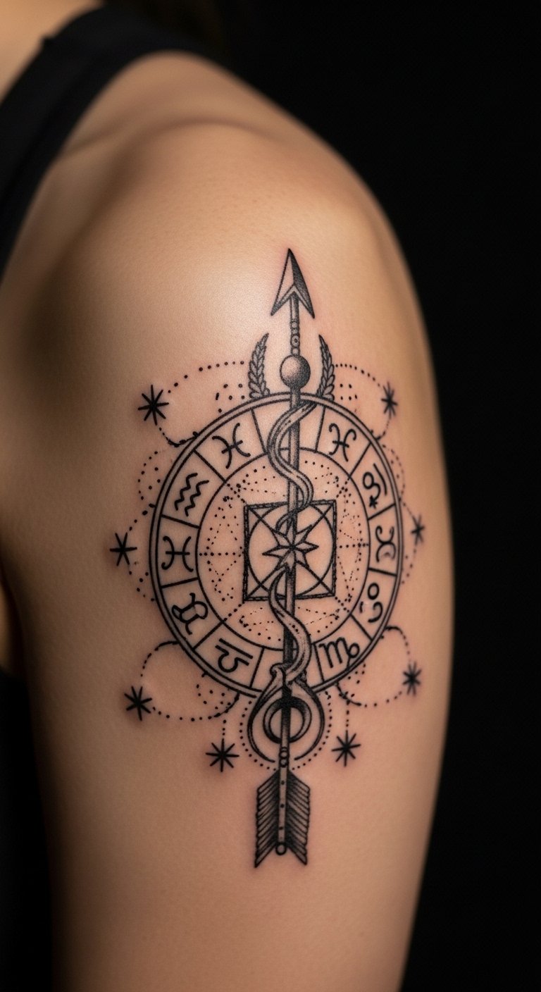Arrow combined with zodiac signs merges stars. This design adds sign icons. Short symbols enhance. It means guided fate. Place on your shoulder for carry. Save with star charts at home. Free zodiac apps help. Use glowing stickers. Look for sign sales. Add your birth symbol. This fits astrological vibes. It inspires paths. Plan your stars. You’ll align better.