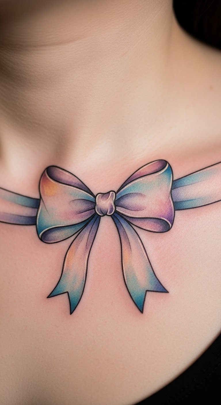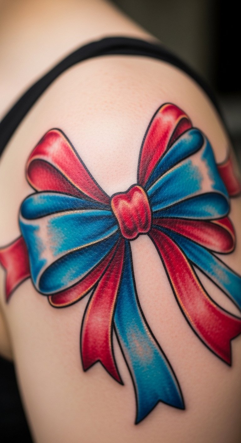 Go bold with a full-color bow that adds life to your style. This design pops with hues like red or blue for a personal touch. Put it on your shoulder for easy visibility. Look for budget artists offering deals under $150. Experiment at home by coloring in bow sketches with markers. It helps you pick colors that match your wardrobe. Full-color bow tattoo brings fun to outfits. Choose shades that reflect your favorites. Book a session focused on color to keep things efficient. Blend in elements like hearts for extra meaning. The result stays bright with regular touch-ups. Wear protective clothing to shield it from sun fade.