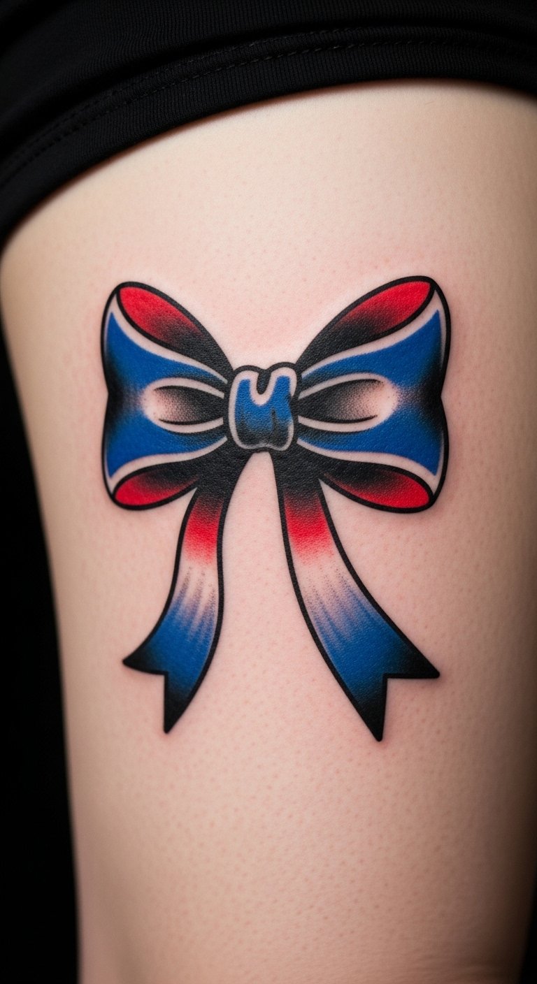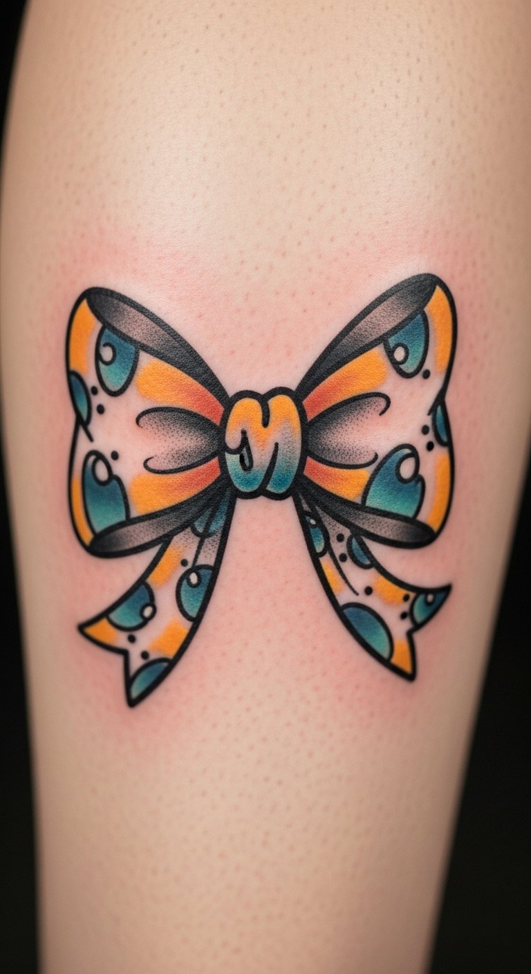 New school bows bring a cartoon twist with exaggerated lines. They add a playful element to your look. Try this on your calf for daily fun. Find artists with packages around $100. Draw cartoon bows at home for inspiration. It helps narrow down choices. New school bow tattoo fits a lighthearted style. Pick fun colors to match. Schedule a quick appointment. Add quirky details for your story. The design holds up with simple care.