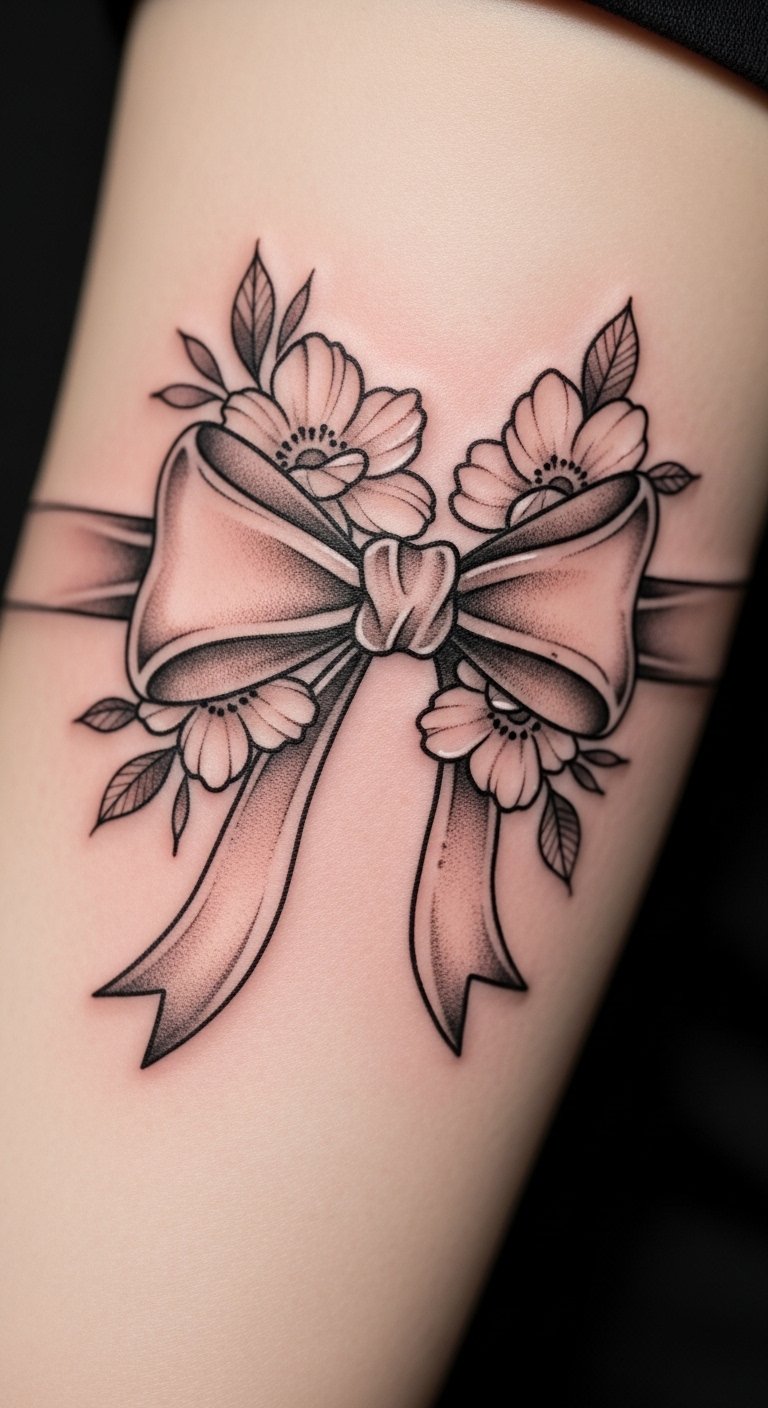 Bows with flowers create a sweet combo. This design mixes nature and charm. Put it on an arm for visibility. Look for paired options on a budget. Sketch flower additions. It sparks creativity. Bow tattoos paired with flowers add beauty. Choose complementary ones. Book together. Personalize the mix. Care for both.