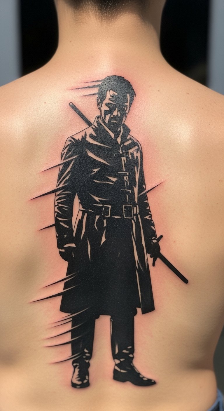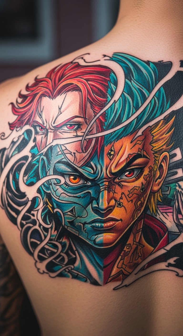 This scene tells a pivotal moment. Draw basics on paper. Effortless. Make temporary with fabric transfers. Cheap option. Artists handle scenes for $100. Focus on essentials. Place on your back for space. Add details slowly. This design narrates. Plan stories simply. Make it engaging.