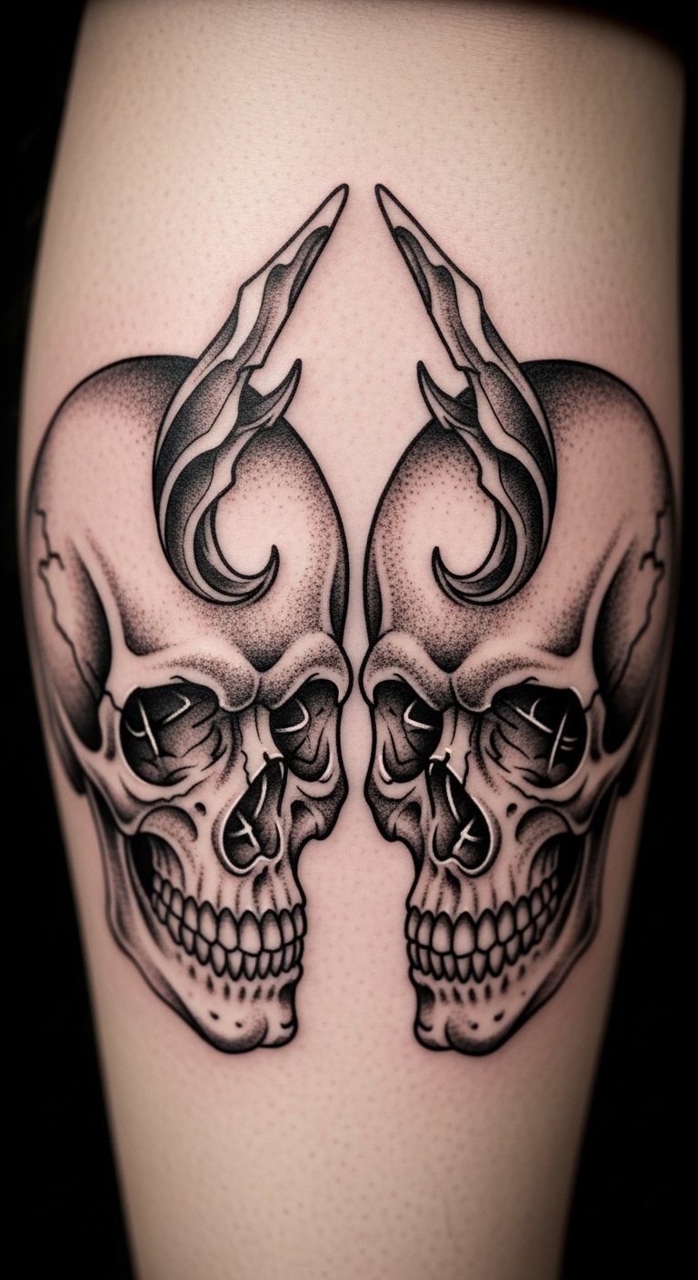 Twin skulls show their silent threat. Trace on paper with a pen. Simple start. Create with clay stamps for skin. Affordable play. Artists do pairs for $80. Keep them mirrored. Place on your leg for balance. Add patterns for edge. This design pairs well. Test symmetry easy. Make it memorable.