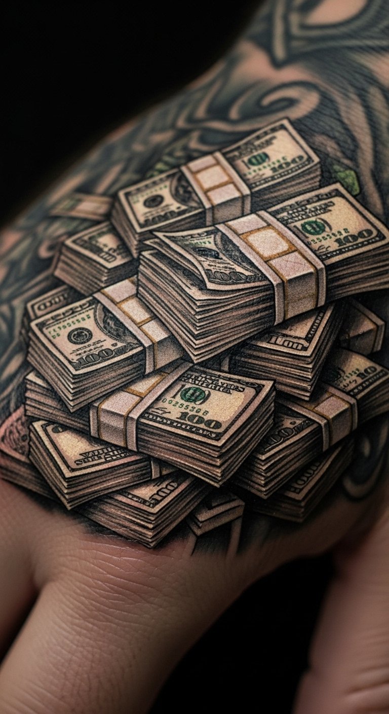 Stacks of cash show the lure. Draw bills on paper with markers. Fast fun. Create with coin rubbings for temporaries. Minimal cost. Artists do this for $70. Keep it stacked. Place on your hand for grip. Add serial numbers. This design stacks up. Test piles easy. Make it count.