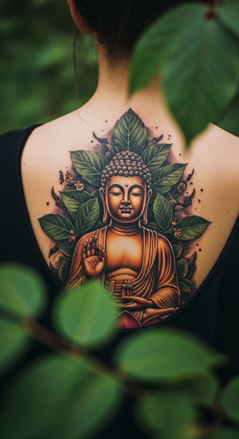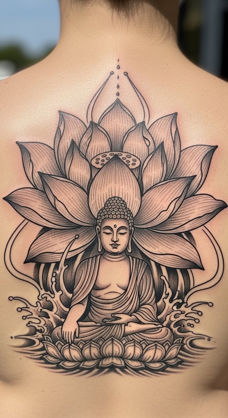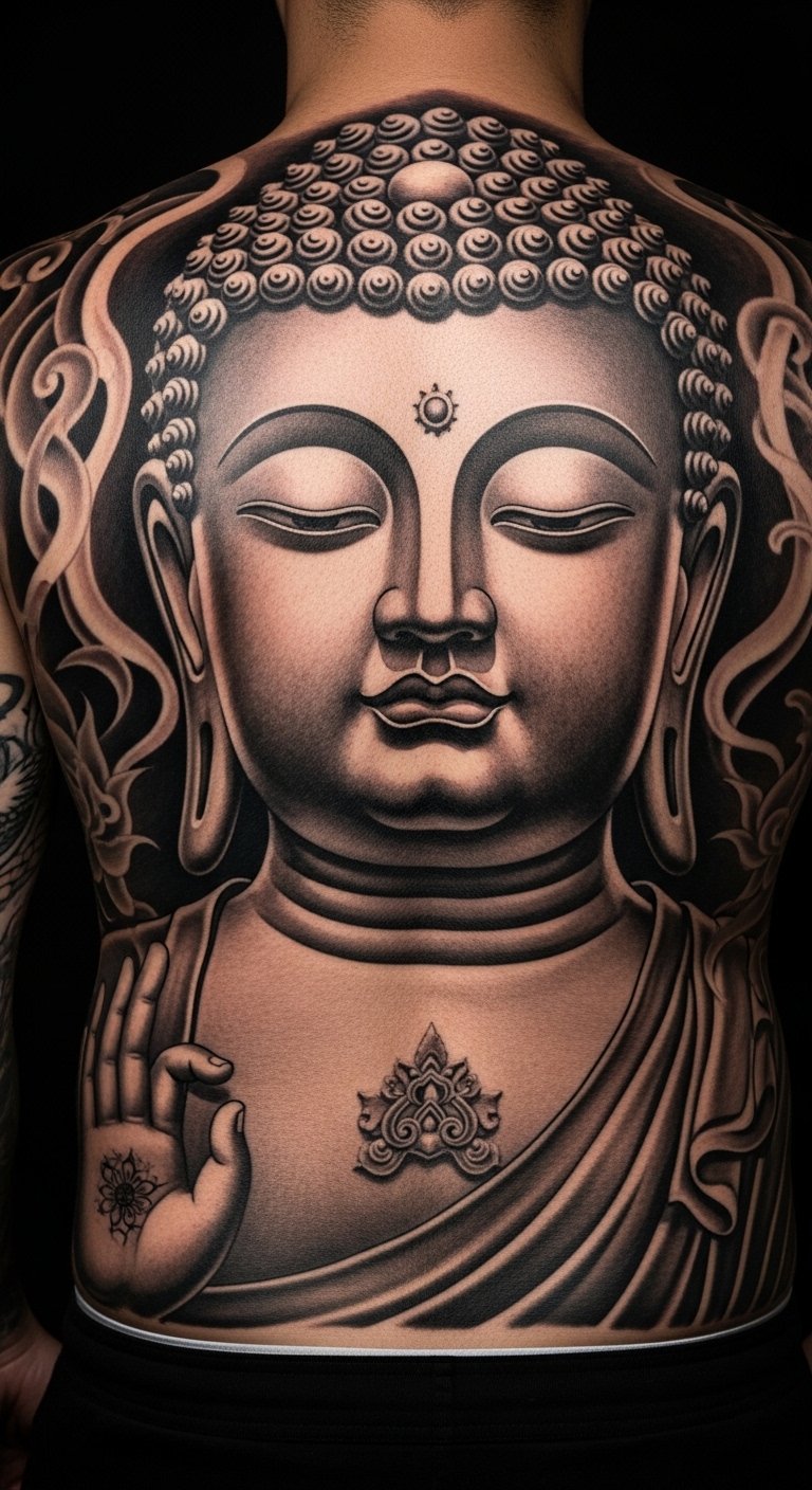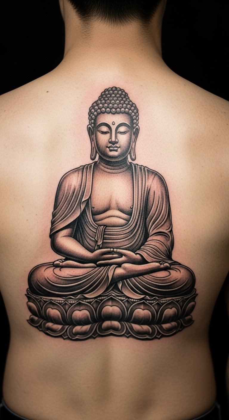 Go for a lifelike Buddha on your back for a bold statement. This design brings out every detail, like facial features and folds in the robe. It turns your back into a canvas of depth and story. Draw inspiration from online photos, but adapt it to your taste. Use affordable tracing paper to copy elements at home. Local artists might offer consultations for free or low cost. Aim for sessions spread out to keep expenses down, around $200 total. After getting it, protect the area with breathable clothing. Realistic styles hold up well with regular care, like moisturizing. This back tattoo suits those wanting a lasting piece that speaks volumes.