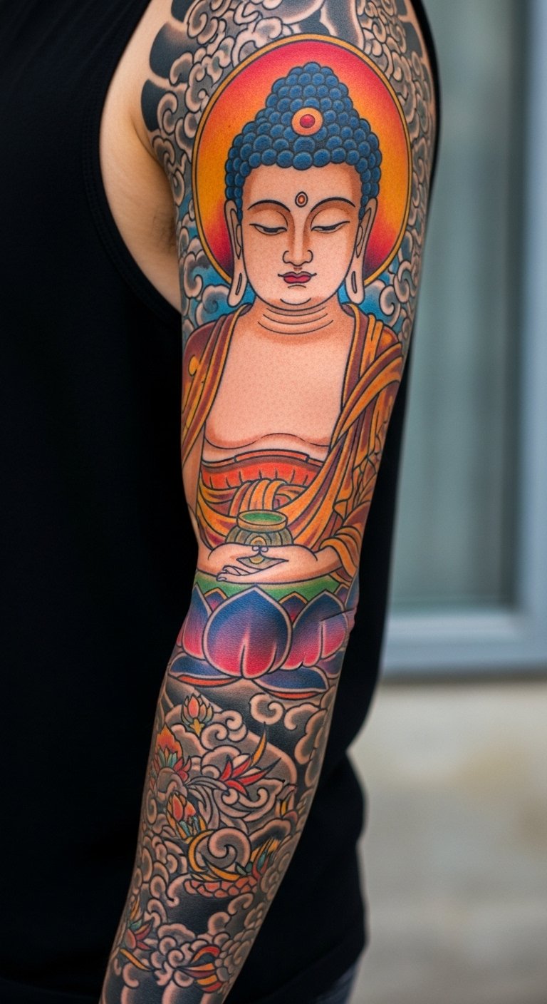 A sleeve with traditional Asian Buddha motifs covers your arm in rich history. Expect patterns with cultural touches, like temple designs. It builds a full story from shoulder to wrist. Gather ideas from public domain images online. Practice with henna kits, which cost less than $10, to preview the look. Find artists who specialize in this style through community forums. Prices start at $150 for smaller sections. Break it into phases to save money. Wear loose sleeves during healing to avoid irritation. This tattoo appeals to folks who value heritage in their ink.