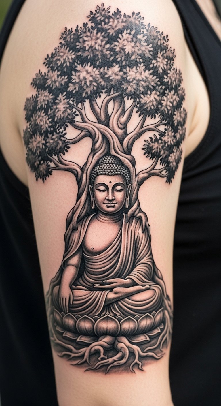 Combine Buddha with a tree for roots in stability. Place it on your forearm for visibility. The tree adds layers to the meaning. Draw with everyday art supplies at home. Leaf stencils from craft stores, costing pennies, help visualize. Look for sales at tattoo events for savings. Sessions might total $100. Use natural oils for aftercare. This tattoo resonates with nature lovers.